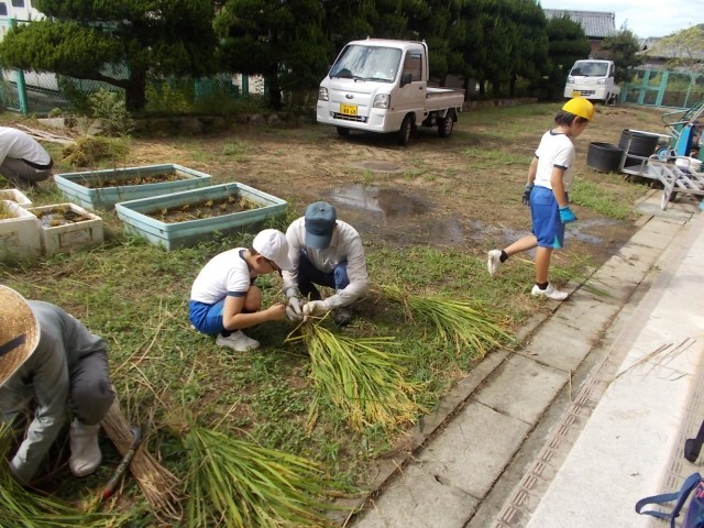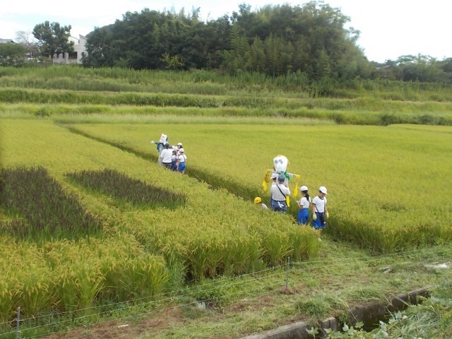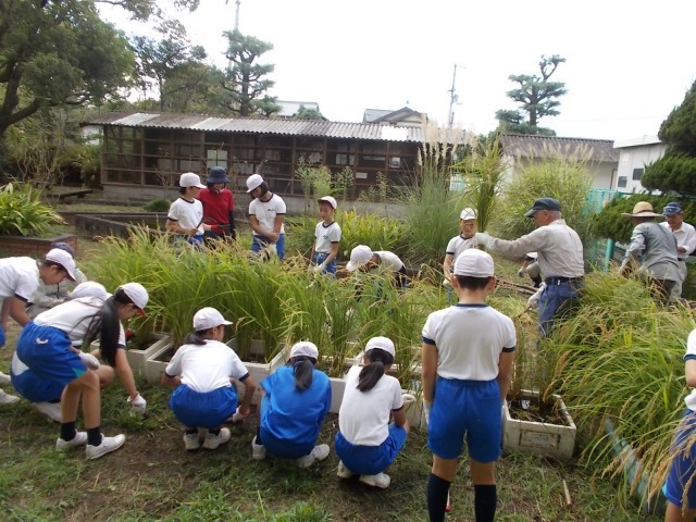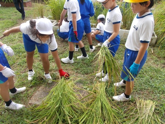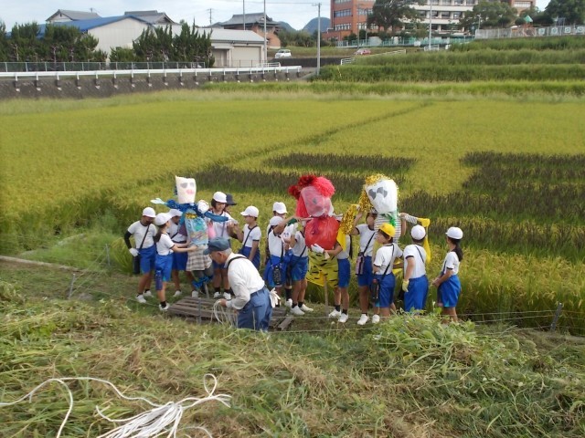 本日、二ノ宮の先生(ふるさと体験農業の会の皆様)のご指導を受けながら、5年生が田んぼに案山子を3体設置しました。案山子は、5年生がクラスで話し合い、材料を工夫しながら制作したものです。田んぼに立てると、一気に秋の風景になりました。また、大きく育ったバケツ稲の稲刈りも体験しました。自分たちが育てた稲を鎌で刈る体験に、子どもたちは少し緊張しながらも楽しそうに取り組んでいました。案山子とともに、田んぼの稲もすくすくと実ってくれることを願っています。