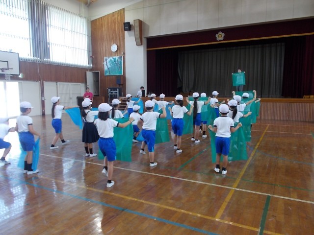 11月6日に行われる「県小・中学校総合文化祭・学校ダンス発表会」に、今年度は本校の3・4年生が参加します。本日からいよいよ練習が始まりました。発表する題目は「豊かな自然へ降り注ぐ雨」です。雨が大地を潤し、命を育んでいく様子を、体いっぱいに表現していきます。初めての練習でしたが、子どもたちは真剣に先生の動きを見ながら取り組んでいました。これから回を重ねるごとに、仲間と息を合わせ、表現力豊かなダンスに仕上がっていくことでしょう。当日の舞台で、自然の恵みを感じさせるすてきな踊りを披露できるよう、みんなで力を合わせてがんばります。