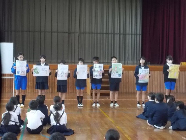 本日、全校集会を行いました。放送・環境委員会から「清掃の仕方」についての呼びかけがありました。ほうきの使い方や、時間いっぱいていねいに掃除すること、自分の担当場所を責任をもって仕上げることなど、日々の取組を見直す大切さを伝えてくれました。子どもたちも、自分の清掃の仕方を振り返りながら真剣に聞いていました。続いて、「給食」についてのお話がありました。マナーを守りながら、楽しい雰囲気で食べること、そしてできるだけ残さず食べることの大切さについて全校で確認しました。残飯を減らすことは食べ物を大切にする心につながります。明日からまた、感謝の気持ちをもって給食に向き合ってほしいと思います。今後も全校で声を掛け合いながら、よりよい学校生活をつくっていきます。