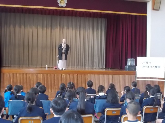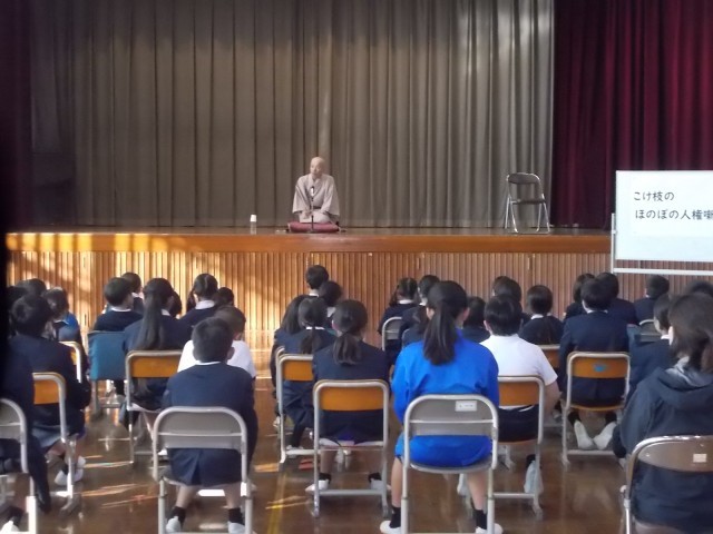 本日、本校にて人権講演会を行い、落語家の 桂こけ枝様 をお招きして「こけ枝のほのぼの人権噺」をご披露いただきました。落語ならではの軽妙な語り口の中に、人を思いやることや相手の気持ちを大切にすることの大切さが込められており、子どもたちも、笑顔とまなざしの真剣さを交えながら学ぶ姿が見られました。今回のお話は、これからの学校生活の中で、子どもたちがよりよい人間関係を築いていく大きな学びとなりました。こけ枝様には、温かいメッセージを届けていただき、心より感謝申し上げます。