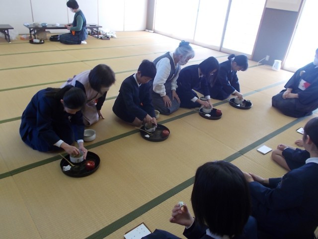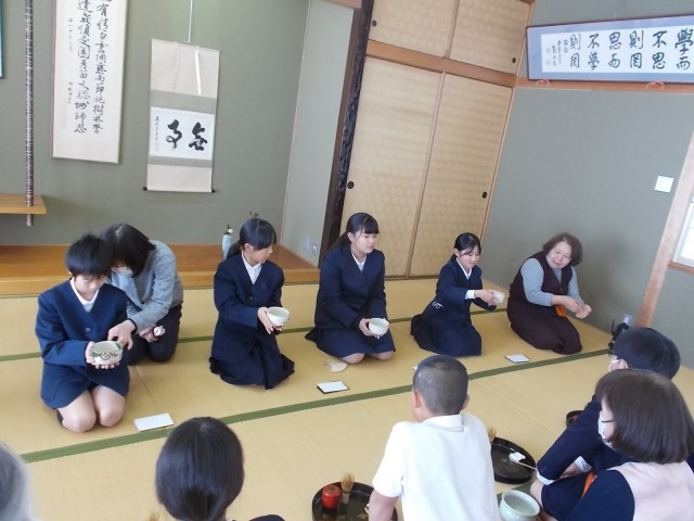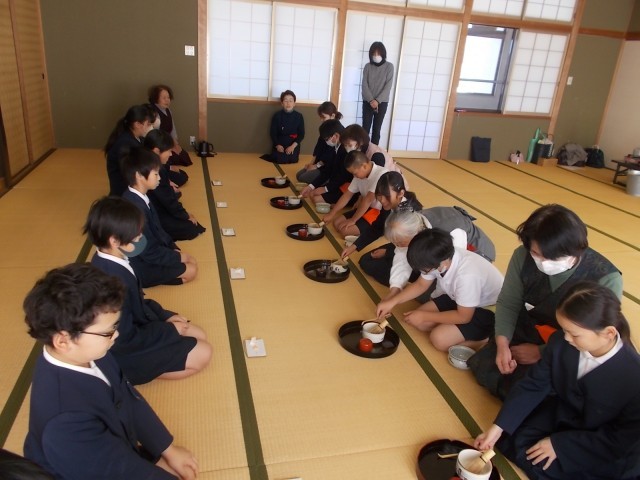 本日、4階和室にて、5年生と6年生を対象に茶道教室を行いました。講師として、二ノ宮地区で活動されている地域の茶道クラブの先生にご来校いただきました。教室では、和室での畳の歩き方から始まり、薄茶点前の流れやお茶のいただき方、さらにお菓子の出し方や食べ方まで、一つ一つ丁寧に教えていただきました。子どもたちは、所作一つ一つに込められた意味を考えながら、日本の伝統文化に触れる貴重な時間を過ごしました。また、これまでに教えていただいたことを振り返り、3学期に予定している卒業茶会に向けて、これから大切にしていきたい心構えを確認しました。ご指導くださった二ノ宮の先生に、心より感謝申し上げます。