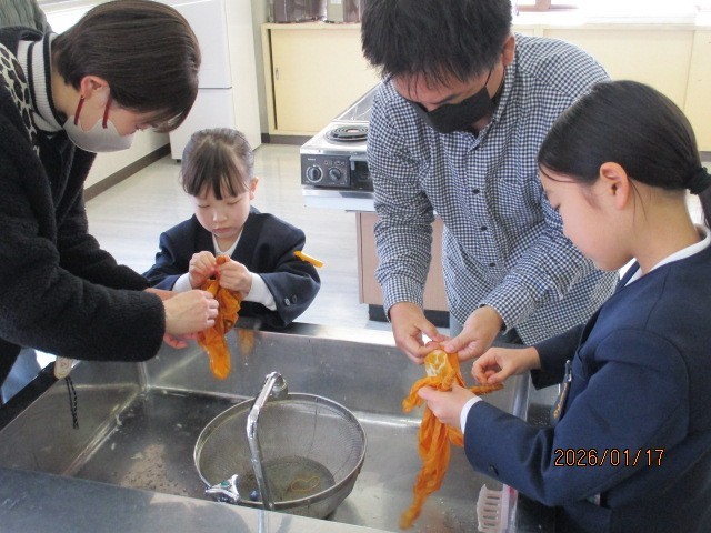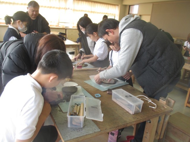 本日、授業参観と親子ふれあい活動を実施しました。授業参観では、全学年で、「一人一人が大切にされるとはどういうことか」、「違いを認め合い、共に生きるために自分にできることは何か」など、各学年の発達段階に応じた人権・同和教育の授業を行いました。授業には保護者の皆様にも参加していただき、子どもたちは自分の考えを伝えたり、友だちや保護者の意見を聞いたりしながら、学びを深めていました。改めて、人を思いやる気持ちの大切さを感じる時間となりました。授業後の親子ふれあい活動では、玉ねぎの皮を使った草木染、PPテープのかご作り、陶芸用の土を使った小皿作りに取り組みました。どの講座でも、親子で相談しながら作業を進め、完成を喜び合うなど、和気あいあいとした温かな雰囲気が広がっていました。笑顔あふれる交流の中で、親子の絆がより深まるひとときとなりました。本日の活動を通して、人権について「知る・考える」学びと、親子で「共に過ごし、感じる」時間の両方を大切にする一日となりました。ご来校いただいた保護者の皆様、誠にありがとうございました。