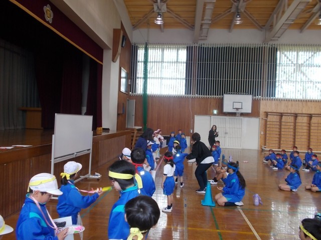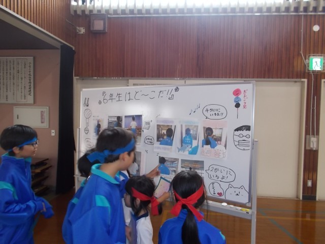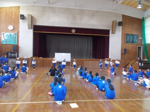 本日、全校児童で1年生歓迎会を行いました。6年生が中心となって企画・運営し、1年生を温かく迎える心のこもった会となりました。はじめに、1年生が一人一人、元気に自己紹介をしました。少し緊張しながらも、自分の名前や好きなことをしっかりと伝える姿がとても微笑ましかったです。また、2年生からは心のこもった手作りのメダルがプレゼントされ、1年生はとても嬉しそうにしていました。その後は、6つの色別グループに分かれて活動しました。自己紹介の後、「フルーツバスケット」などのゲームを楽しみ、学年をこえて交流を深めることができました。再び体育館に集まり、全校児童で「ジャンケン列車」や「だるまさんが転んだ」を行い、大きな歓声と笑顔が広がりました。さらに、6年生が校舎内に隠れ、それを探し出す「シールラリー」では、ヒントを基に校内を巡る姿が見られました。活動の最後には、グループごとにお弁当やお菓子を楽しみ、和やかな時間を過ごしました。1年生にとっては、小学校生活のよいスタートとなる一日になったことと思います。そして、6年生の頼もしい姿や、全校で支え合う温かい雰囲気を改めて感じることができた歓迎会となりました。今後も、学年をこえたつながりを大切にしながら、全校でよりよい学校づくりを進めていきます。
