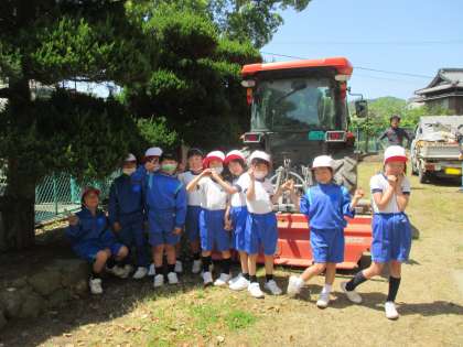 今日は環境・放送委員さんがきれいにしてくれた学級園を、耕して畝たてをしました。三谷さんに協力をいただき、トラクターなど専門の機械を使って、広い学級園を耕してもらいました。耕した後には、2年生が小さいショベルを使って、畝の形を整えてくれました。