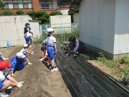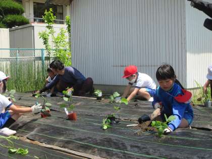 待ちに待った、野菜の苗植えの日がやってきました。保護者の三谷さんを講師に招いて、オクラの種まき、ピーマンやナス、サツマイモなど、たくさんの野菜の苗を植えました。