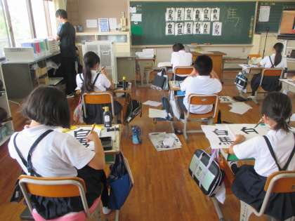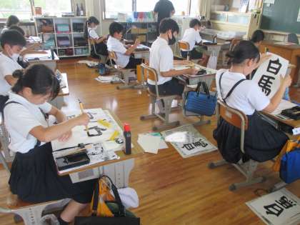 5年生は今、書写の時間に「白馬」という文字を書いています。文字の画数などによって文字の大きさを工夫し、美しく見えるように練習しています。今日は白馬の2時間目です。
