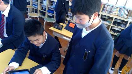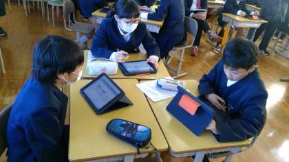 6年生は普段の授業から、自分の考えがもてると友だちと答えの確認をしあいます。今日もiPadを使って友だちと考えを交流していました。