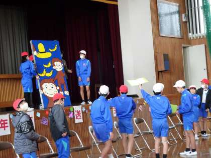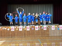 下級生が6年生にお祝いの言葉と色紙メッセージを贈った後、6年生から下級生にうれしいプレゼントの披露がありました。(縄跳びのジャンプ台にイラストをかいてくれた6年生、ありがとう!)