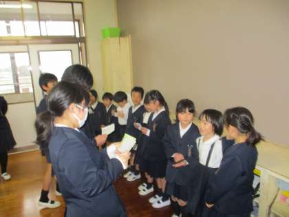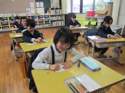 お世話になった人に、「ありがとうカード」を書きました。「6年生が、毎日安全に学校に連れて来てくれたよ。」「困ったときに、助けてくれたよ。」「一緒に遊んでくれたよ。」「トイレの掃除を一生懸命してくれたよ。」と6年生への感謝の気持ちがあふれました。「藤井教頭先生の体育の授業が楽しかったよ。」「お勉強が分からないとき福島先生が教えてくれたよ。」とお世話になった先生方にもお礼の気持ちを丁寧に書くことができました。