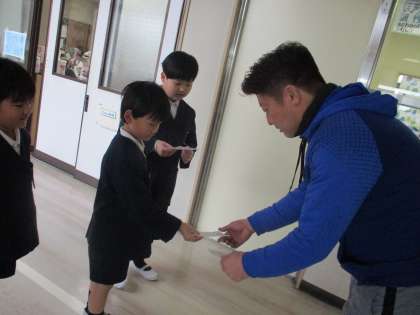 カードを渡しに行くと、とてもよろこんでくれました。渡している1年生の顔も笑顔いっぱいで、お礼の気持ちを届けられてうれしそうでした。