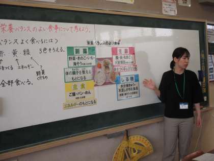 5年生で食育の授業を行いました。栄養教諭の多田先生に、栄養バランスのよい食事とは、「主食」「主菜」「副菜」がそろっている食事だということを教えていただきました。水分補給や不足しがちな食品を補うために、「汁物」もつけるとよいそうです。