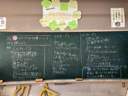 今日の社会の学習では、けいさつかんの仕事についてグループで調べ、発表しました。