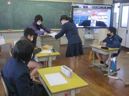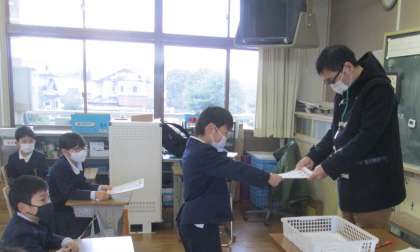 校内なわとび大会で上位入賞の記録を出した人と高瀬町「小さな親切運動」の実行章、作文賞の受賞者の表彰をリモートで行いました。