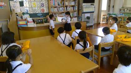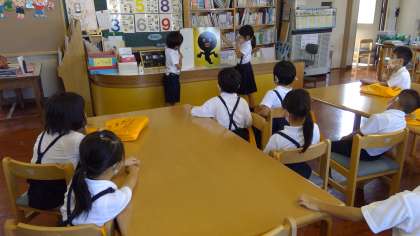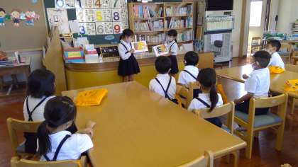 1時間目の読書の時間、2年生が読み聞かせをしてくれました。おべんとうやおばけを題材としたお話で、1年生は大喜び。楽しくて温かい雰囲気の素敵な時間となりました。