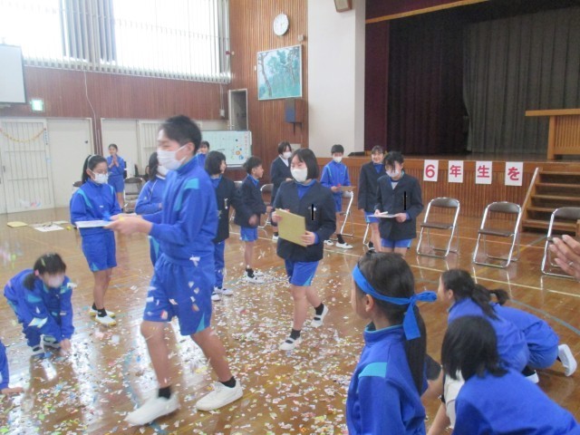 今日、6年生を送る会がありました。低学年は「白黒つけよう」、中学年は「借り物競争」、5年生は「〇✕クイズ」をしてくれました。去年までは、送る側でしたが、今回は送られる側になった6年生。みんな笑顔で楽しく遊び、思い出に残ったのではないでしょうか。下級生が作ってくれた色紙を見て、みんなうれしそうでした。残りの学校生活で、感謝を伝えていきたいと思います。