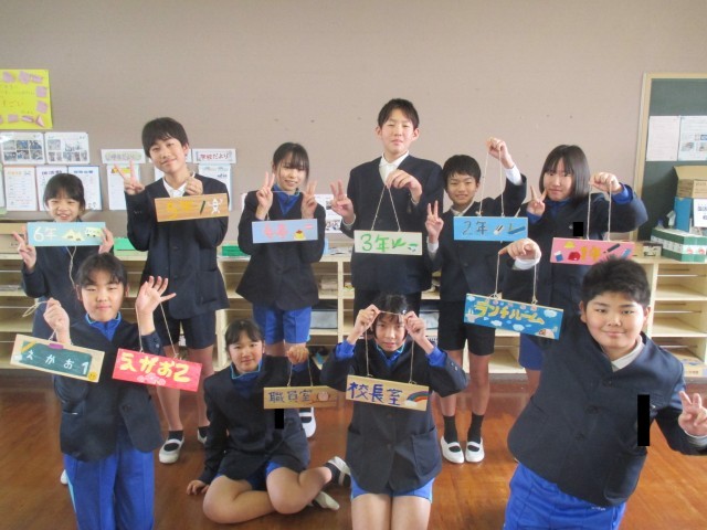 6年生は「学校に何かを残したい」と思い、2月から各学年の教室、えがお教室、校長室、職員室、ランチルームの教室表示の看板を作っていました。今日、全校生にお披露目をしました。各学年に届けに行くと、喜んでもらえたのでうれしかったです。保護者のみなさんも学校に来たとき、ぜひご覧ください。