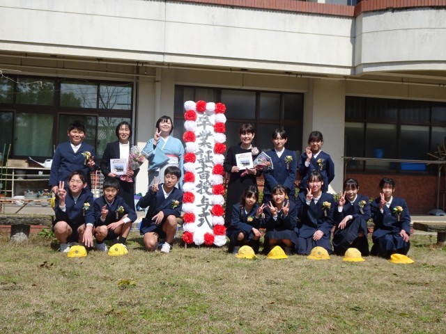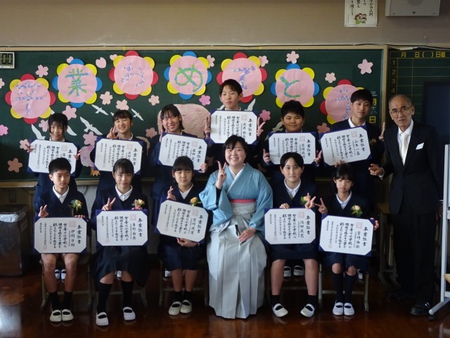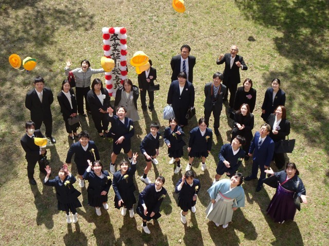 卒業式の後、思い出の6年教室で記念撮影。みんないい顔をしています。南庭では、お世話になった先生方や保護者と一緒に和やかに記念撮影。黄色帽子を空に向かって高く高く放り投げてみたら・・・・ほら、写真の通り、いい感じになりました。
