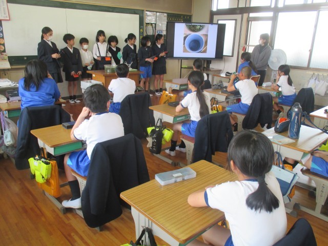 今日のパワーアップタイムの時間に、大切に育てたメダカを5年生に渡しました。育てるときに気をつけるポイントをタブレットを使って説明しました。これから大切に育ててほしいと思います。