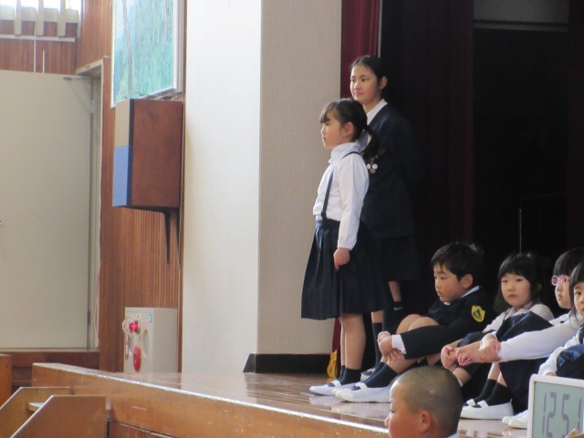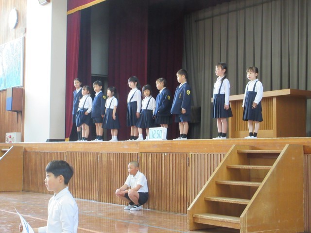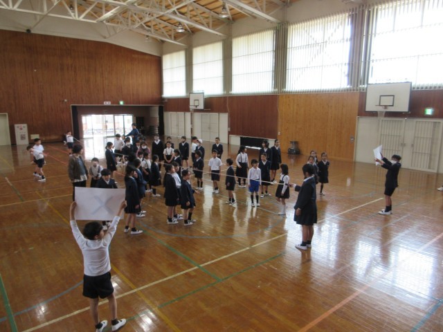今日の昼休みに、体育・飼育委員会主催の全校遊びがありました。1年生に好きな動物や遊びなどを聞き、〇✕クイズを作りました。1年生は2~6年生の前で緊張したと思いますが、大きな声で答えを発表することができました。「1年生〇✕クイズ」が盛り上がってよかったです。
