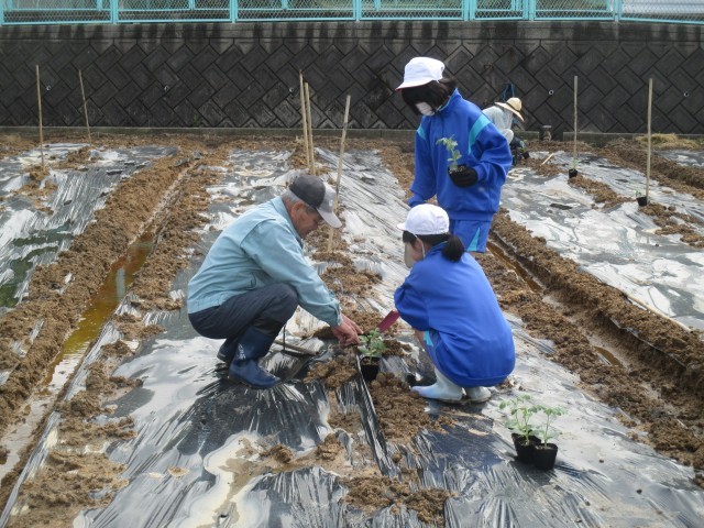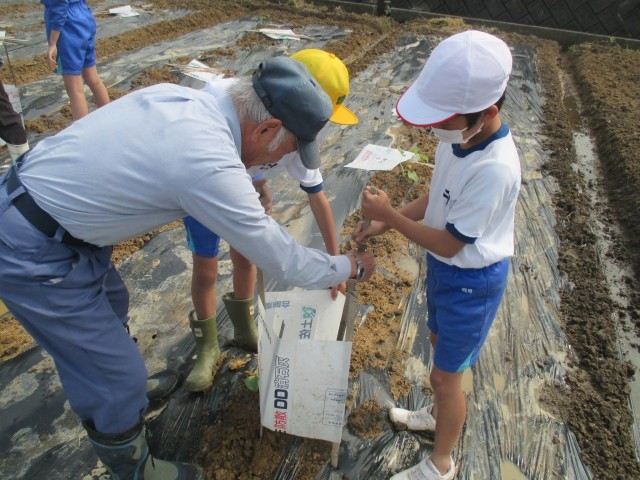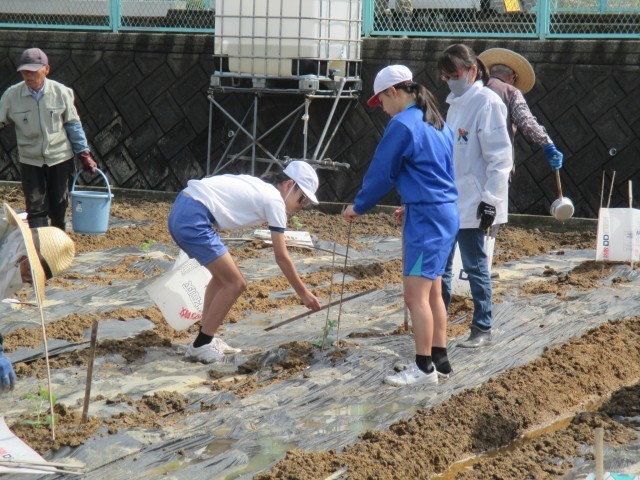 今日、体験農業の方に教えていただきながら、スイカとマクワウリの植え付けを行いました。ペアで協力して、苗を植えて、袋をつけました。先日、まいたスイカの種から芽が出ました。実になるのが楽しみです。