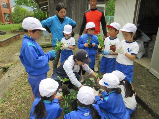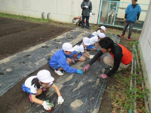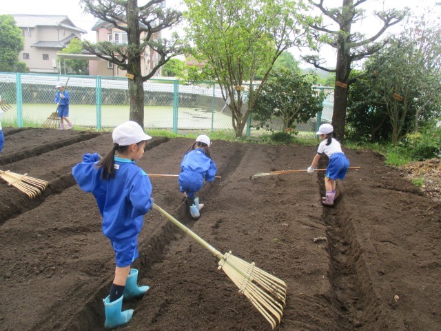今日は、学級園の畝づくりをして、夏野菜の苗を植えました。まず、畝づくりからしました。ゲストティーチャーに教えてもらいながら、子どもたちが熊手で上手に畝の形にしました。次に、自分たちで選んだ夏野菜の苗を植えました。「毎日、水やりを頑張るよ!」と言いながら、とてもうれしそうでした。