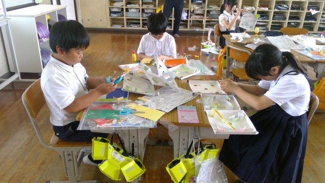 子どもたちは前もって考えてきた図案を参考に作成中です。