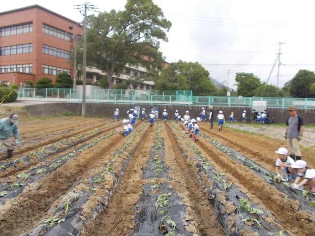 本日、1・2・3年生が「二ノ宮ふる里体験農業の会」の皆様から、さし方などのご指導を受けながら、芋のつるさし体験を行いました。今回植えた芋の品種は「鳴門金時」だそうです。3年生にとっては、今年で3回目の「つるさし」体験ということもあり、手際よく上手に植える姿が見られました。秋の収穫が今からとても楽しみです。