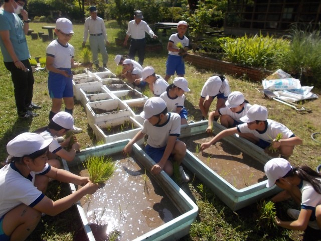 5年生のバケツ稲の田植えの様子