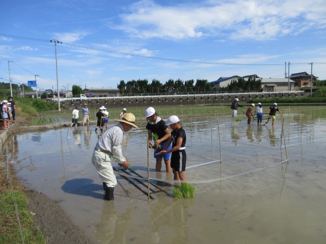 3・4・6年生の田植えの様子を紹介します。昨日に引き続き、本日も、二ノ宮の先生(二ノ宮ふる里体験農業の会の皆様)にご指導いただきながら、子どもたちは自分たちで種から育てた苗の田植えを行いました。今回は、用意していただいた「田植えの定規」を使い、苗が浮かないよう丁寧に植えました。二宮小の文字部分には古代米(黒米)を、その周りにはモチミノリを植えました。これからの稲の成長がとても楽しみです。貴重な体験の機会をいただき、ありがとうございました。