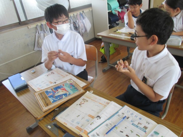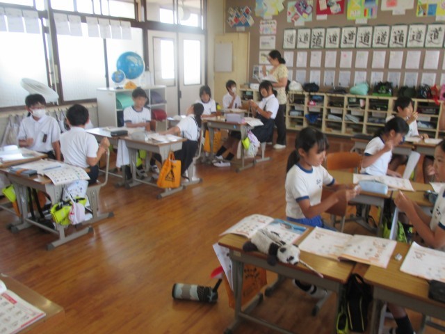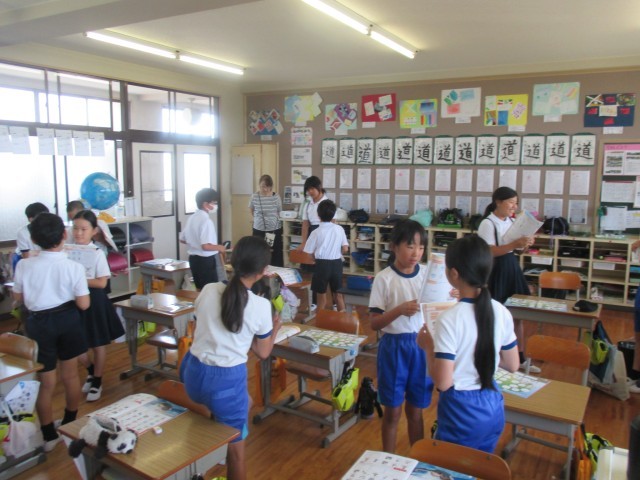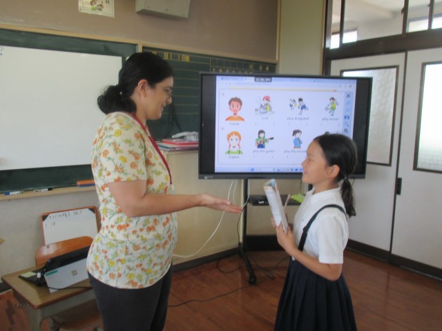 キャサリン先生との外国語の時間には、「自分ができること・できないこと」「I can cook well. 」「I can't fly. 」「Can you play the piano?」など、『can』を使った言い方を習っています。「すること」の単語をフラッシュカードで練習したり、ペアになってお互いに質問し合ったりしています。なかなか難しく、何度も練習を重ねて頑張っています。キャサリン先生とペアになって練習する子もどんどん増えてきました。高学年の外国語では、中学年での「話す・聞く」に加え、単語を読めたり書き写したりすることが出来るようになるのが目標です。ワークシートやカードなどにもアルファベットで書き込みます。自分の名前も高さに気を付けて丁寧に書けるようになってきています。ALTの先生との貴重な時間を大切に、外国語や外国の文化などを学んでいってほしいと思います。