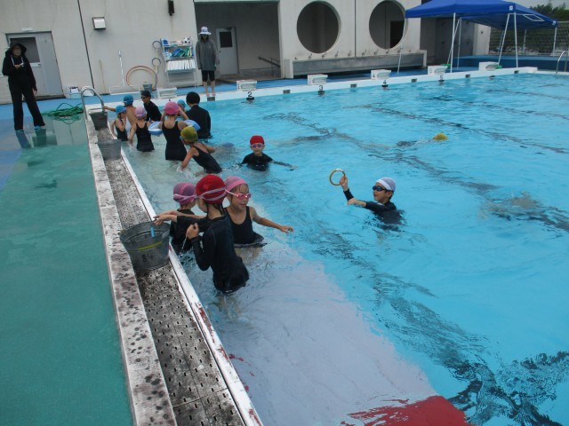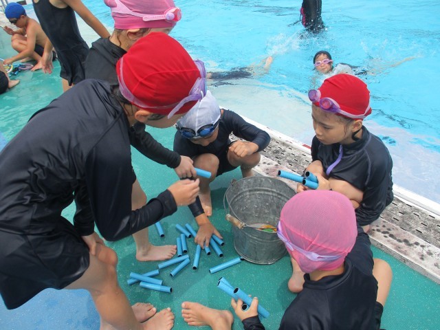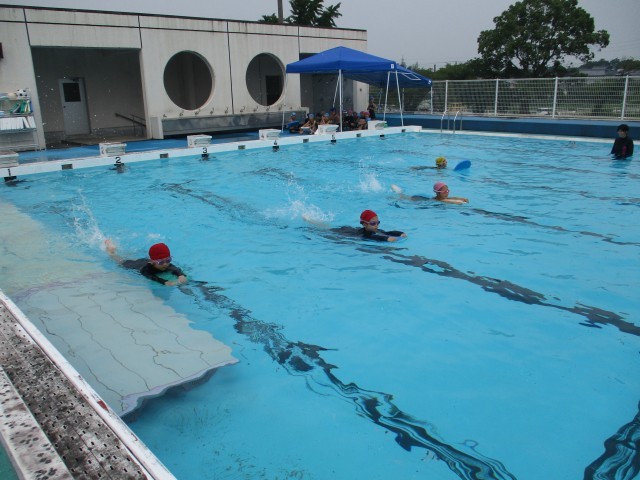3時間目が、1,2年生の水泳大会でした。ビート板を持ってバタ足に挑戦する子、ビート板をもたずにバタ足に挑戦する子に分かれて泳ぎました。15メートルで10点満点でしたが、25メートルまで泳ぎきる子もたくさんいて、一人ひとりが一生懸命頑張って泳ぐことがえできました。ホース拾いも、一生懸命深いところまで潜り、チームみんなで頑張ることができました。炎天下の中、保護者の方が応援してくださり、子どもたちの力になりました。ありがとうございました。