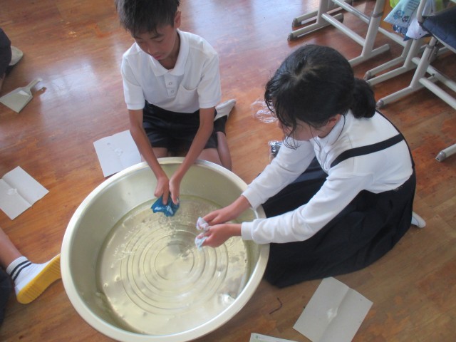 今日の1時間目の家庭科で、前の日に使ったハンカチと靴下を洗濯しました。しっかり力を入れてつまみ洗いをしたので、手洗いの大変さに気づきました。グループで協力して水を変えたり、最後の片づけをしたりすることができていました。授業で学んだことを生活にも生かしてほしいと思います。