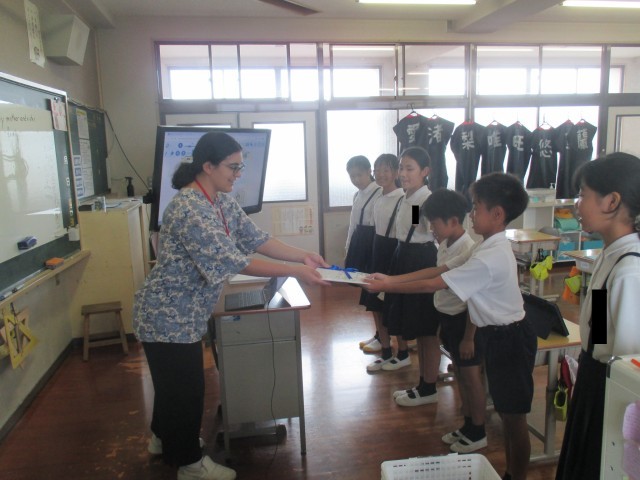 今日、ALTの先生の最後の授業でした。1学期の内容の復習をし、自分の今までの思い出のスピーチをしました。クラゲチャートにメモし、英語の文章を作りました。相手の目を見ることや大きな声で言うことなどを意識してしました。2学期からは新しいALTの先生になります。中学生に向けてこれからも頑張ってほしいです。