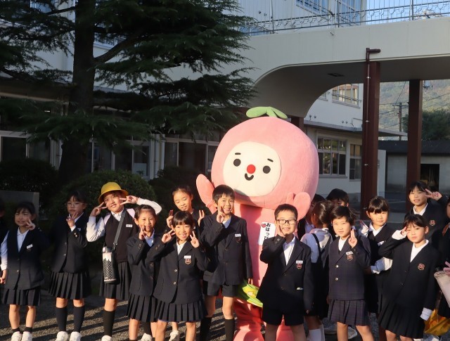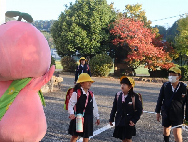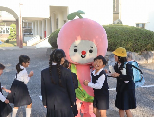 11月7日(金)朝、香川県あいさつ運動のキャラクター「おはっぴー」が比地小学校に来てくれました。
