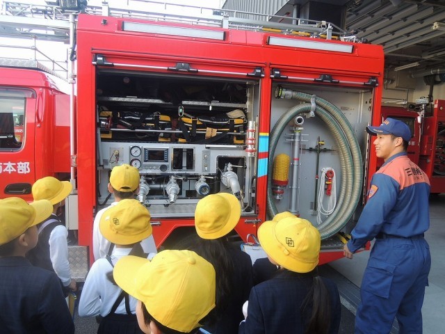 消防車や救急車の説明を聞いたり、防火服を着せてもらったりしました。