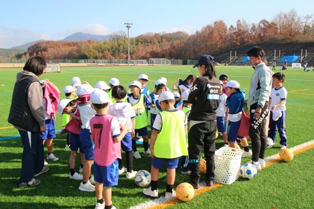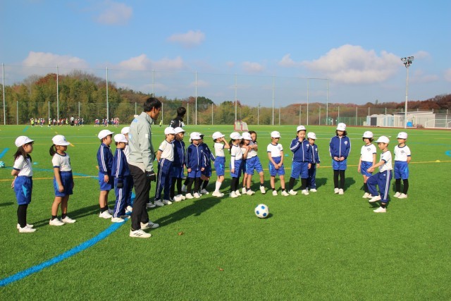 山本町にある宝山湖サッカー場で、プロのサッカー選手と一緒に活動しました。