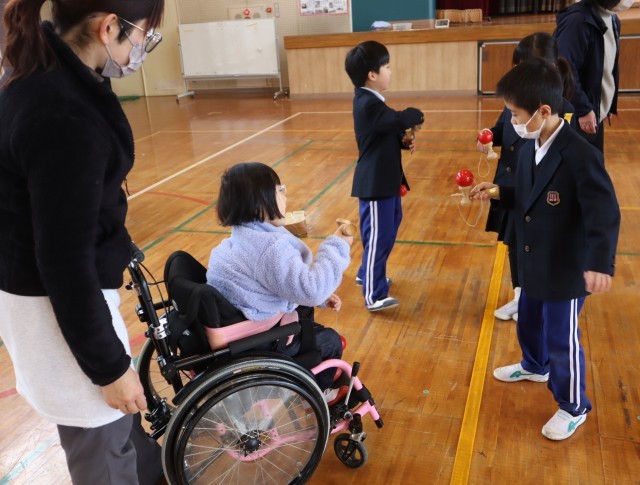 「けん玉」「福笑い」「あやとり」「お手玉」「竹とんぼ」の5つのコーナーを用意し、新1年生に楽しんでもらいました。