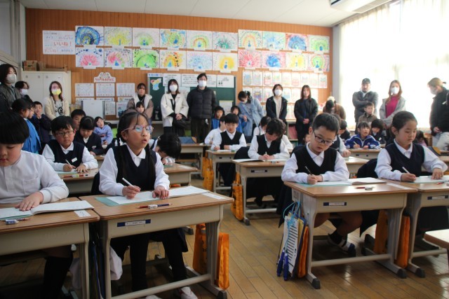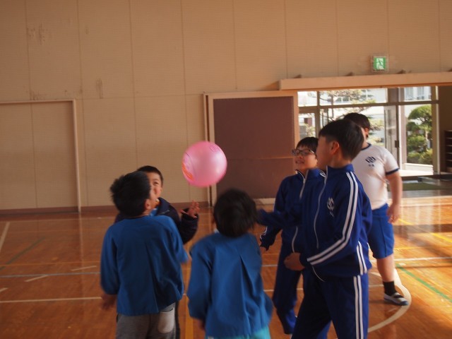 1年生の授業を親子で参観した後、保護者へ説明を行い、新入生は5年生とのふれあい遊びを楽しみました。