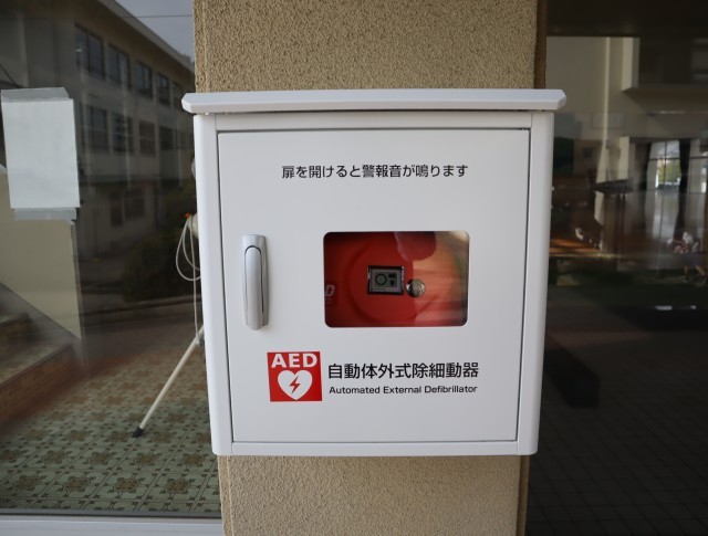 これまでは校舎内(事務室前)に設置していましたが、校舎外でも迅速に使用できるよう、設置場所を追加しました。