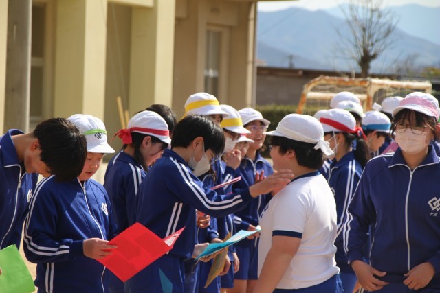 在校生からの心のこもった色紙のプレゼントをして、6年生を見送りました。