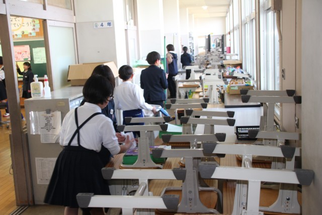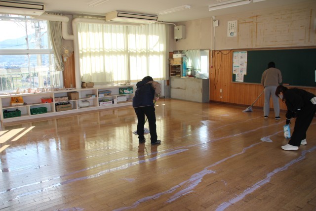 児童が下校した後、職員でワックスがけを行い、教室をきれいに仕上げました。