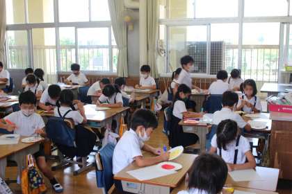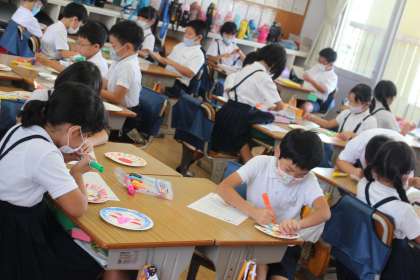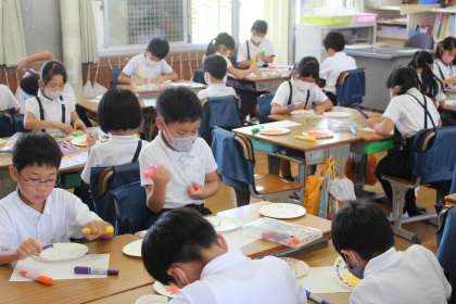9月7日(火)、図工の時間に、自分のひらめいたことを紙皿に書きました。自由に思い思いに楽しそうに描くことができました。