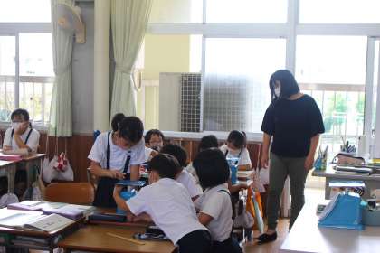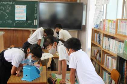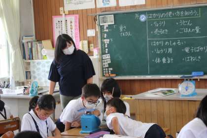 9月7日(火)算数の時間に、はかりを使って、身の回りの物の重さをはかりました。メモリを正しく読めるように、グループで確認し、予想と実際の重さを比べ、重さの理解を深めました。