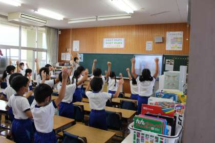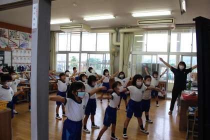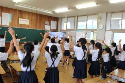 9月9日(木)朝のスポーツタイムで、夏休み前にした「早寝、早起き、朝ご飯」のmimikaさんのダンスを、画面を見ながら思い出して、ダンスを楽しみました。10月末の運動学習発表会で全校で披露する予定です。何よりも体を動かすことが楽しそうです。