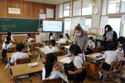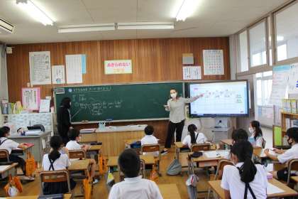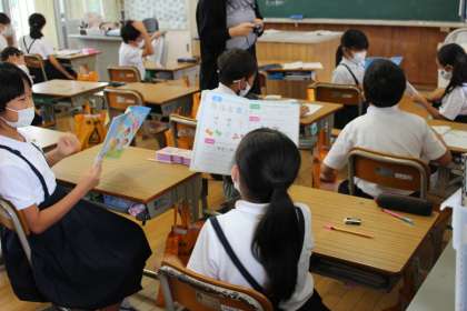 9月14日(火)外国語活動で、「I like〜」で好きな物を尋ねる会話に親しみました。友だちの好きな果物、好きな色、好きなスポーツを予想してから、実際に会話をして確かめました。