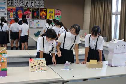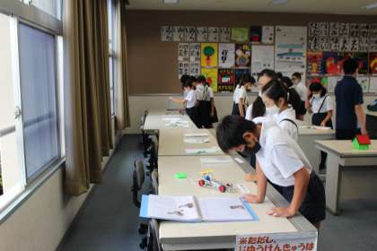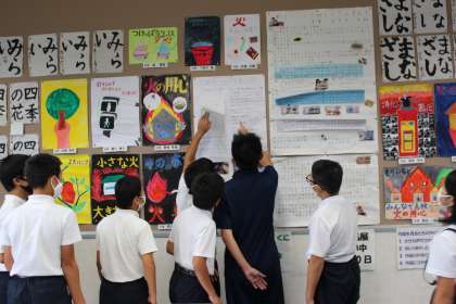 9月15日(水)朝の時間に、6年生全員でコンピュータ室の夏休み作品展を見学しました。工作をじっくり眺めてよいところを見つけたり、自由研究の調べやまとめを読んだりしていました。落ち着いてポスターや習字も鑑賞しました。さすが6年生です。