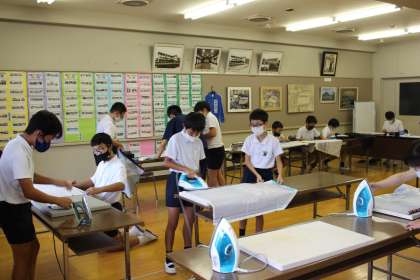 9月15日(水)6年生は家庭科でエプロン制作を始めました。ミシンで縫うためのの準備をしました。アイロンで型をつけ、まち針でとめました。次はミシンを使います。できあがりが楽しみです。