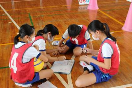 9月15日(水)5年生は「プレルボール」のリーグ戦を楽しみました。ボールをバウンドさせて、3回で相手のコートに返して得点を争うゲームです。みんながボールにふれ、チームで協力してゲームを楽しみました。作戦タイムも盛り上がりました。