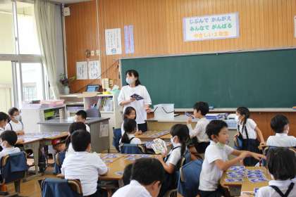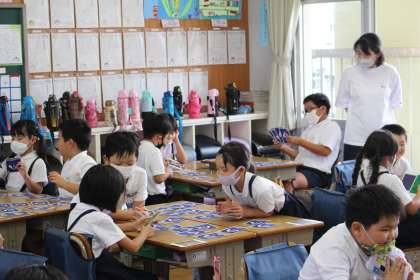 9月16日(木)の学級活動で「MIMOKA ART CARD」を使って「めくってマッチング」というゲームをしました。裏返した絵画のカード2枚をとり、何でもよいので2枚の共通点を話し、よければ自分のカードになるというゲームです。思わず、身を乗り出す子が続出で、大変盛り上がりました。授業参観や、秋の遠足にもつながっていきます。