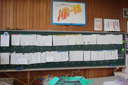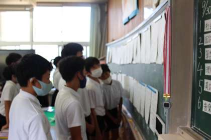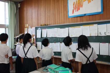 10月1日(金)の朝の会の後、6年生は昨日、各自が作成した運動学習発表会のプログラムの表紙をよく見て代表を決めました。全体のていねいさ、テーマの内容、イラストの3つの観点で、全員が審査して、投票しました。